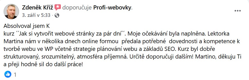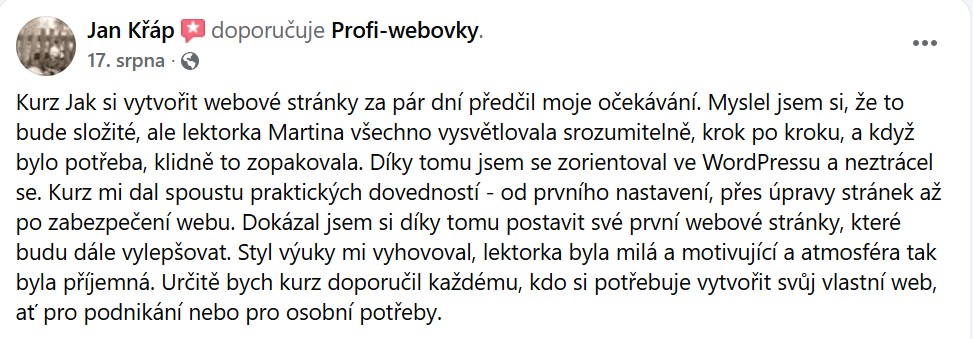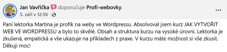 „Absolvoval jsem kurz Jak si vytvořit webové stránky za pár dní. Moje očekávání byla naplněna. Lektorka Martina nám v několika dnech online formou předala potřebné dovednosti a kompetence k tvorbě webu ve WP včetně strategie plánování webu a základů SEO. Kurz byl dobře strukturovaný, srozumitelný, atmosféra příjemná. Určitě doporučuji dalším! Martino, děkuju Ti a přeji hodně sil do další práce!“