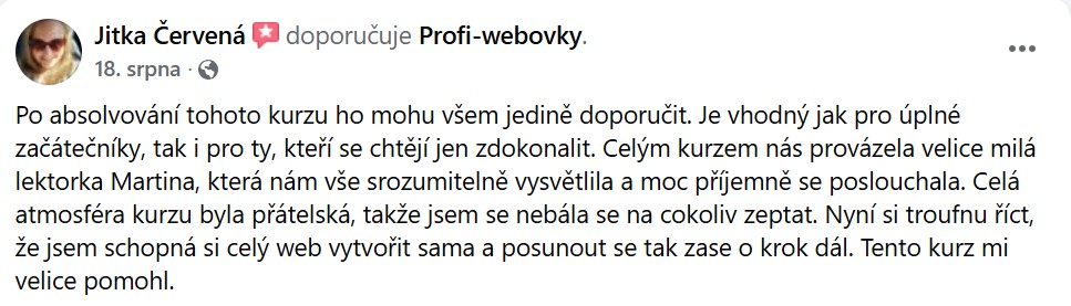 „Po absolvování tohoto kurzu ho mohu všem jedině doporučit. Je vhodný jak pro úplné začátečníky, tak i pro ty, kteří se chtějí jen zdokonalit. Celým kurzem nás provázela velice milá lektorka Martina, která nám vše srozumitelně vysvětlila a moc příjemně se poslouchala. Celá atmosféra kurzu byla přátelská, takže jsem se nebála se na cokoliv zeptat. Nyní si troufnu říct, že jsem schopná si celý web vytvořit sama a posunout se tak zase o krok dál. Tento kurz mi velice pomohl.“