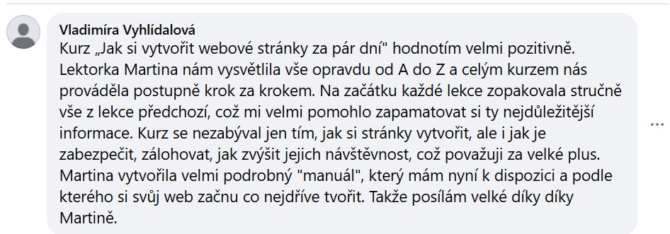 „Kurz „Jak si vytvořit webové stránky za pár dní“ hodnotím velmi pozitivně. Lektorka Martina nám vysvětlila vše opravdu od A do Z a celým kurzem nás prováděla postupně krok za krokem. Na začátku každé lekce zopakovala stručně vše z lekce předchozí, což mi velmi pomohlo zapamatovat si ty nejdůležitější informace. Kurz se nezabýval jen tím, jak si stránky vytvořit, ale i jak je zabezpečit, zálohovat, jak zvýšit jejich návštěvnost, což považuji za velké plus. Martina vytvořila velmi podrobný „manuál“, který mám nyní k dispozici a podle kterého si svůj web začnu co nejdříve tvořit. Takže posílám velké díky díky Martině“